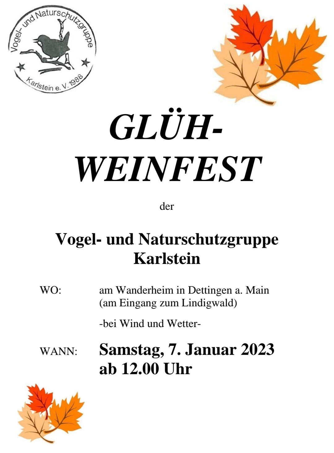 Endlich findet wieder das traditionelle Glühweinfest am Wanderheim statt. Am 7. Januar feiert die Vogel- und Naturschutzgruppe Karlstein e.V. nach 2 Jahren Pause zusammen mit allen Karlsteinerinnen und Karlsteinern sowie Gästen aus Nah und Fern. Treffpunkt ist am Samstag, 7. Januar 2023 ab 12:00 Uhr am Wanderheim im Holzweg, Karlstein-Dettingen (Nähe Tennisplatz). Neben heißem Glühwein, Apfelwein und Kinderpunsch gibt es kleine und große Leckereien für Jung und Alt: